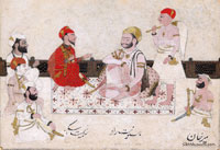 Ranjit Singh himself was seated in the European manner in a plain arm chair, and by him was Raja Hira Singh... Kushal Singh, the Jemidar, and Raja Sushet Singh, were the only state officers present. The last, a very fine distinguished man, wore a black and gold enamelled helmet with the visor open, and ornamented with three large black herons' feathers. (Hugel, 1845) [6]