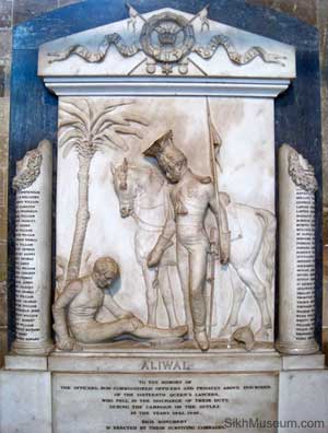 The Sutlej Campaign Memorial at Canterbury Cathedral built in 1848 to commemorate the British soldiers of the 16th Lancers killed in the battle of Aliwal during the first Anglo-Sikh War features a Sikh helmet.