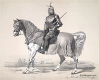 The Cavalry is Runjeet's favourite arm, and he has spared no pains to render it efficient. The total strength is estimated at 40,000, or thereabouts of which 4,000 only are regulars. They comprise two regiments of Lancers and six of Dragoons; disciplined according to the French system by Monsieur Allard, a distinguished officer of the Imperial Army. The regular Cavalry are well mounted and equipped, and in large bodies work well together. The Dragoons are fine men, armed with long carbines, pistols and swords. Their appointments are of black leather, with jack boots. Clothing scarlet, with green facings, and close fitting steel helmets, of the Roman pattern. The Lancers are dressed in blue, with scarlet facings, and a profusion of lace; have high cloth caps, and are armed with lances twelve feet in length, surmounted with the tri-coloured flag. The Ghorechurras or body-guard, 2,000 in number are the best mounted of the Sikh Cavalry. To them Ghorechurras or body-guard, 2,000 in number are the best mounted of the Sikh Cavalry. To them is entrusted the safety of the Rajah's person. They are excellent swordsmen, and equally expert with the matchlock and lance. Their dress is superb, being an under tunic of padded crimson silk, over which is worn ornamental chain armour of the most beautiful workmanship, covering almost every vulnerable part. The head-dress, a conical turban of bright yellow silk, surmounted by a brazen head piece, from which the chain armour descends, and is crowned by long waving heron plumes. [2]
