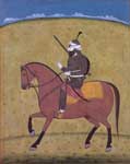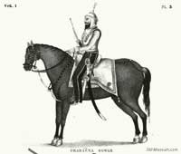 The irregular levies and jagirdari contingents of horse, not included in the above, cannot be accurately determined, but they may be fairly estimated at 30,000 men. These were the picturesque element in the Maharaja's reviews. Many of the men were well-to-do country gentlemen, the sons, relations, or clansmen of the chiefs who placed them in the field and maintained them there, and whose personal credit was concerned in their splended appearance. There was no uniformity in their dress. Some wore a shirt of mail, with a helmet inlaid with gold and a kalgi or heron's plume; others were gay with the many coloured splendours of velvet and silk, with pink or yellow muslin turbans, and gold embroidered belts carrying their sword and powder horn. All wore at the back, the small round shield of tough buffalo hide. These magnificent horsemen were armed some with bows and arrows, but the majority with matchlocks, and which they made excellent practice. (Griffin, 1892) [5]