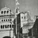 The twin Miri-Piri Nishan Sahibs in front of the Akal Takht are visible in this photograph. One is a dark color, likely blue while the other is a light color, likely kesri orange.
