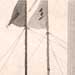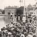 A rare photograph where the symbols on the Miri-Piri Nishan Sahibs are clearly visible. In most early photographs the symbols are not visible due to motion blur caused by slow camera shutter speeds. While the darker Nishan Sahib is folded in the wind, the katar dagger above a dhal shield and a straight sword below are clearly visible on the lighter banner. It is interesting to note that the sword has a straight blade and not a curved blade as seen on other 19th century banners.