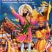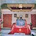 The large Nishan Sahib behind the Guru has a plain yellow background with an arrangement of weapons.