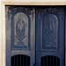 A large emblem appears on the door panels composed of a chakkar quoit with large central khanda sword and two crossed axes below the chakkar. Completely inside the chakkar from handle to blade tip are two curved swords on either side of the khanda sword.