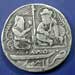 A very rare coin and one of the only coins produced during the reign of the Sikh Empire with human figures. Maharaja Ranjit Singh is depicted presenting a lotus flower to Guru Nanak. Between the two figures can be seen a Nishan Sahib with patterned outer border and an inner bordered segment.