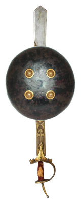 The large broad sword that Wilkins observed was likely a khanda sword and the black shield would have been a dhal shield made of cowhide or rhinoceros leather.