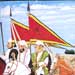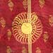 During the First and Second Sikh Wars, eyewitness records indicated seeing black, yellow, red and green flags with various colored borders and images on them. [2] The majority of the captured battle standards are similar in appearance. The battle standards are very large, 8.2 feet by 6.2 feet at the widest point. [3] They have a red silk background, with a yellow patterned border. The red field of the banner is divided by three narrow gold horizontal bands crossing the banners. On one side is a central motif of a yellow sun and a red background which is covered with a block printed pattern of gold flowers. On the other side of the banner is a central motif of the Hindu Goddess of War Durga in black riding on a lion or tiger with two attendants and the red field of the banner is covered with a repeating block printed dark scroll pattern.