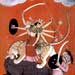 The two Maharaja Sher Singh military banners in the Soltykoff sketch also have central motifs related to the theme of victory in battle. The banners contain two of the Matrikas, a group of Hindu war goddesses that are usually depicted together. One banner has a central motif of the war goddess Kaumari. Within Hinduism Kaumari is considered the power of Kumara, the god of war. Kaumari is depicted on the banner riding a peacock, with multiple heads and holding weapons in her multiple arms. The other battle standard only partially visible in the Soltykoff sketch shows a depiction of the war goddess Varahi described in Hinduism as the power of Varaha - the boar-headed form of Vishnu or Yama - the god of death, with a boar head on a human body. [7] Varahi is depicted on the banner holding weapons in her multiple arms.