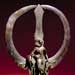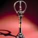 Experts at both the Cleveland Museum and The British Museum which hold these two sculptures have identified the large weapon appearing behind Shiva as a trishula trident. The outer circular prongs of the trident are once continuous curved piece that tapers to a point and bears a strong resemblance to the Chandra crescent moon symbol that is also associated with the Shiva deity. The central vertical point of the spear has multiple sharp edges that suggest it a flat broad khanda like sword. The broad khanda like sword is a very ancient weapon, images of which have been found on Indian pottery dating to 1500 B.C. [2] and is also sometimes seen in depictions of Shiva.