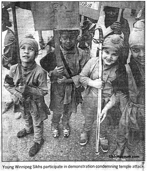 The demonstration denounced Indian Prime Minister Indira Gandhi and her Government for the attack by the Indian army on the Sikh Golden Temple in the Punjab region of India, which left hundreds dead nearly two weeks ago.