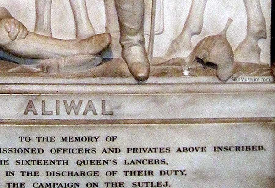 The Sutlej Campaign Memorial at Canterbury Cathedral built in 1848 to commemorate the British soldiers of the 16th Lancers killed in the battle of Aliwal during the first Anglo-Sikh War features a Sikh helmet.