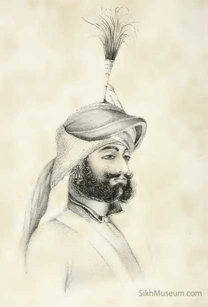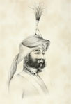 He is high in Runjeet's favour, as well as much respected and admired by all the Sikhs, and about twenty-eight years of age. His dress was magnificent; a helmet or scull cap of bright polished steel inlaid with gold, and a deep fringe of chain mail, of the same material reached to his shoulders, three plumes of black heron's feathers waving on his crest, and three shawls of lilac, white, and scarlet, twisted very round and tight, interlaced with one another and gathered round the edge of the helmet, a chelenk of rubies and diamonds on his forehead. (Osborne, 1840) [3]