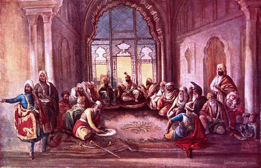 Visiting Amritsar and Lahore and preparing preliminary sketches of the locations as well as observations of the Sikh Royal Court and accounts he had heard of what it had been like during the time of Maharaja Ranjit Singh, Schoefft was able to get a good sense of Maharaja Ranjit Singh’s Royal Court. Schoefft successfully combined reality with imagination to create scenes that he had never witnessed, but which were based on bits and pieces of real scenes that he had sketched along with his imagination of events and details that may have been. Thus Schoefft laid the foundation work for his two most famous epic historical paintings of the Court of Lahore and Ranjit Singh at Darbar Sahib.