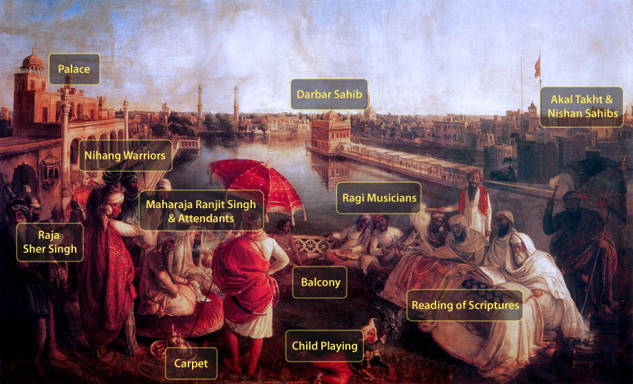The painting of Maharaja Ranjit Singh at Darbar Sahib if full of interesting details and important historical information. From the location, to the people to the scriptures, everything depicted has a story to tell. Read the stories and analysis of various parts of the painting by clicking on a section below.