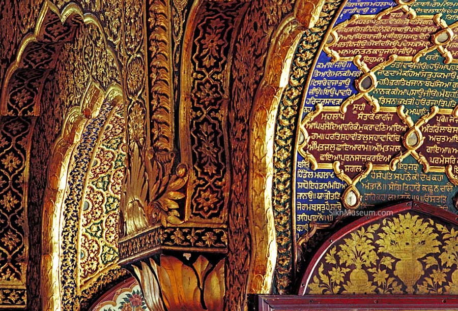 Verses from the Guru Granth Sahib in gold lettering adorn parts of the ceiling of inner sanctum of Darbar Sahib. Photographer Sandeep Singh Brar