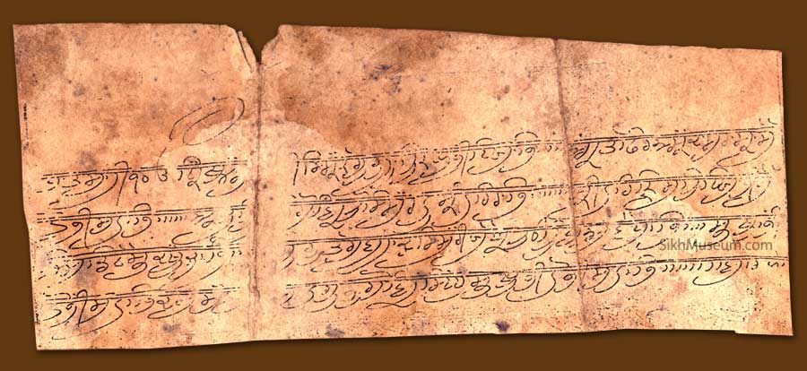 Early partial fragment of the Sikh daily praye in a highly stylised form of the Gurmukhi script. Probably written after the death of Guru Gobind Singh and before the ardas was codified. The limbs of the letters and some vowel sounds like the aunkar are elongated while some of the kannas are buried. Also in this type of writing some letters such as the "rara" and the "dada" are buried in the preceding letter.