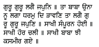 "Everyone chanted "Guru Guru". Baba (Nanak) taught them true belief and devoutly they chanted, "Guru Guru". The sakhi (story) is finished. Another sakhi follows, a sakhi describing the occasion when Baba (Nanak) ji visited Kashmir."