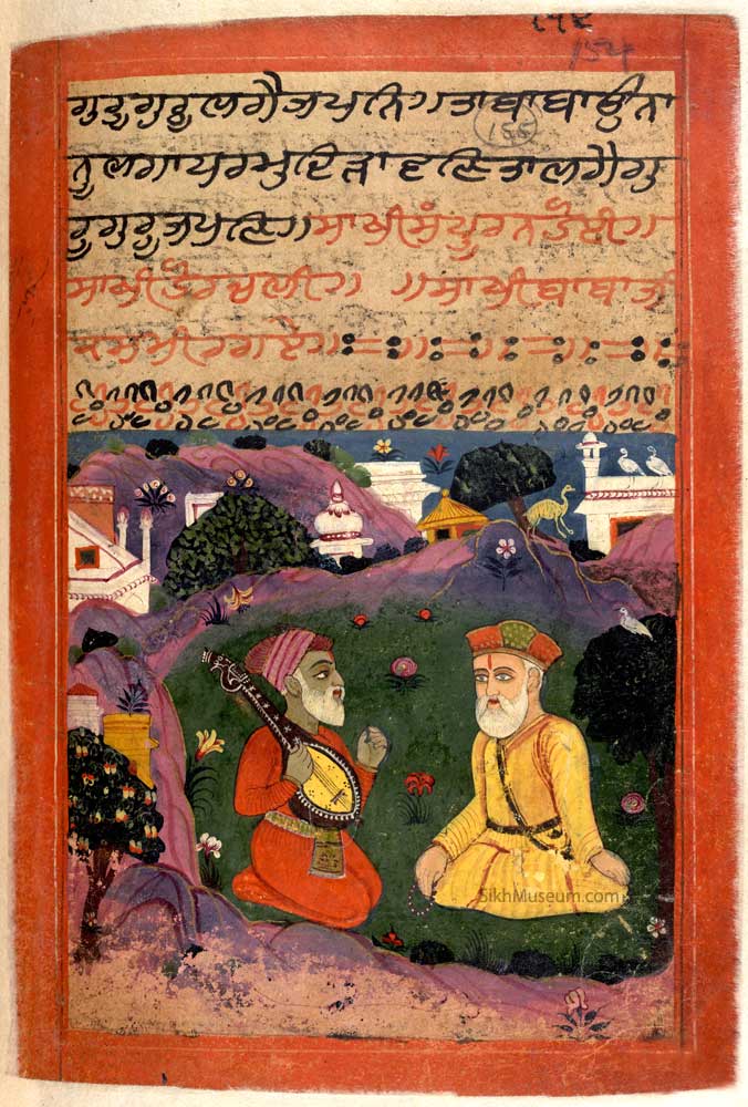 Page from the B40 Janamsakhi manuscript. This manuscript is considered one of the best surviving early collection of oral and written stories about the life of Guru Nanak. It is recorded as having been written by a scribe called Daia Ram Abrol and is illustrated with 57 paintings by the artist Alam Chand Raj. This page contains a painting of Guru Nanak and his lifelong friend the Sikh musician Baba Mardana in Kashmir.