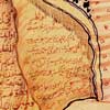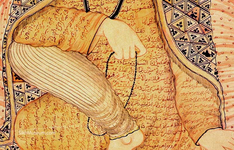 Depiction of Guru Nanak in a classical pose of contemplation. The robe that the Guru wears is illustrated with calligraphy in the Arabic naskhi script with verses of the Koran. The sleeves and a part of the hem of the robe contain the Guru's own composition Japji Sahib. The artist may have been inspired by the robe Guru Nanak is said to have received with verses of the Koran as a gift from the Caliph of Baghdad during his fourth great journey (1517-1522) to the West where he visited Baghdad, Mecca and Medina. That robe is preserved at Gurdwara Dera Baba Nanak in Punjab.
