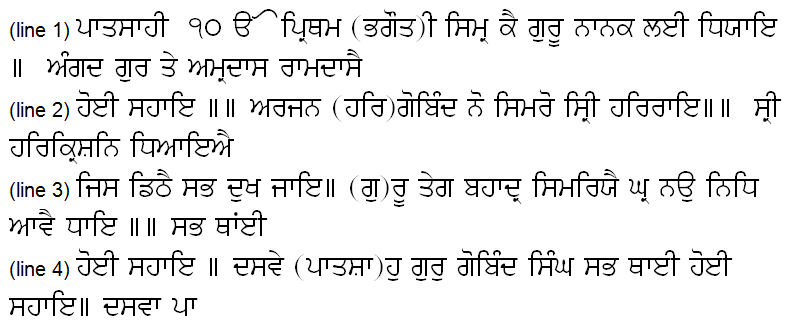 "...Tenth Master. First remember the Divine Might, and then meditate on Guru Nanak. Then pray to Guru Angad, Amardas and Ram Das for support. Remember Arjan, Hargobind and Holy Har Rai. Meditate on Sri Harkrishan, seeing whom all suffering vanish. Remember Tegh Bahadur, who brings the nine treasures to our home. May they support us everywhere. May the Tenth.."