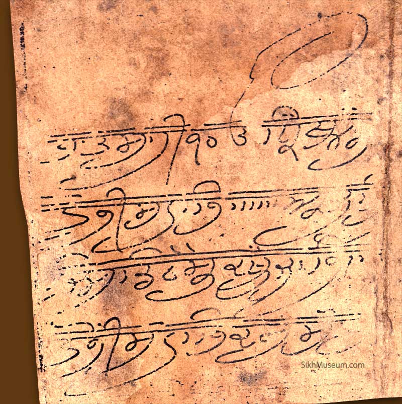 Early partial fragment of the Sikh daily praye in a highly stylised form of the Gurmukhi script. Probably written after the death of Guru Gobind Singh and before the ardas was codified. The limbs of the letters and some vowel sounds like the aunkar are elongated while some of the kannas are buried. Also in this type of writing some letters such as the "rara" and the "dada" are buried in the preceding letter.